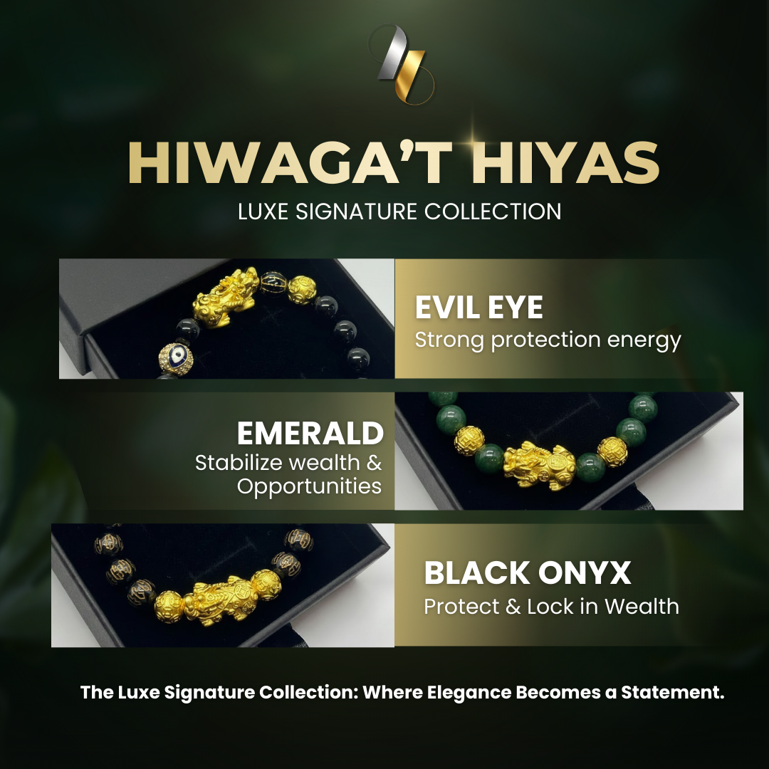 Hiwaga’t Hiyas Premium Collection features meticulously crafted bracelets made with authentic natural stones and powerful feng shui symbols. Designed for those who value elegance with meaning, each piece represents wealth, protection, balance, and refined energy—where luxury meets intention.